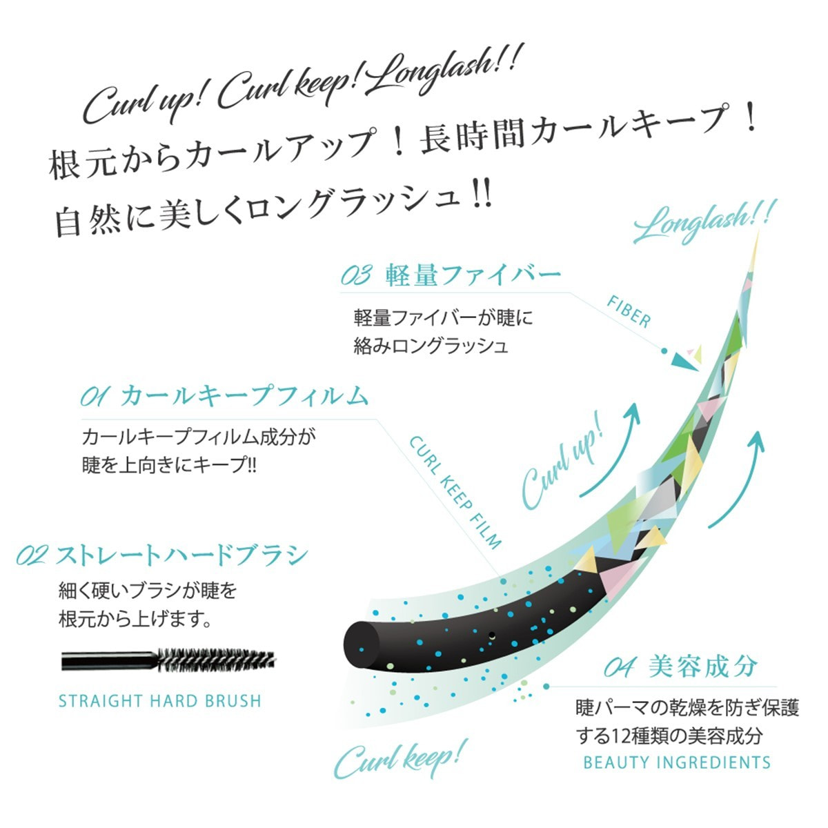 独自開発のカールキープフィルム成分がまつ毛1本1本を特殊なフィルムで包み、